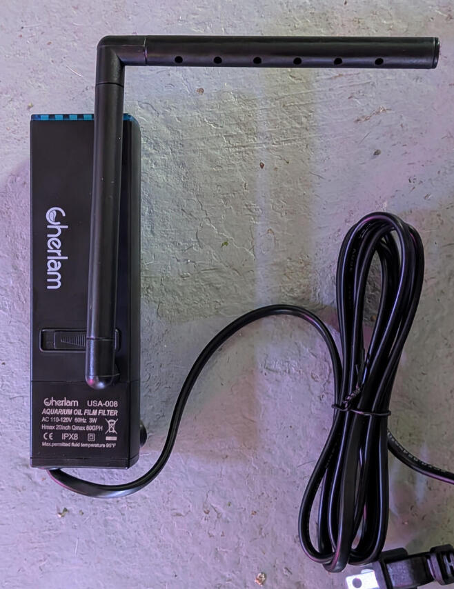 Le filtre de surface Cherlam 3W est un petit écumeur d’huile (oil film skimmer) conçu pour éliminer efficacement le film gras à la surface des aquariums jusqu’à environ 20 gallons (≈ 75 litres), tout en améliorant la circulation et l’oxygénation de l’eau.• Puissance : 3 watts, faible consommation pour usage continu.